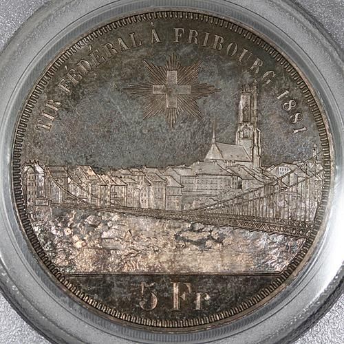 スイス Switzerland スイス射撃祭 フリブール Fribourg 5フラン銀貨 Specimen strike 1881年 PCGS SP63