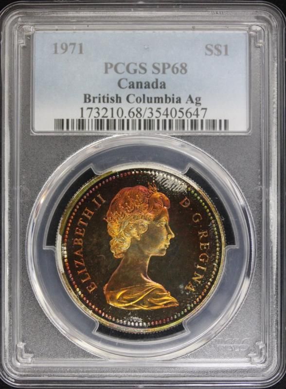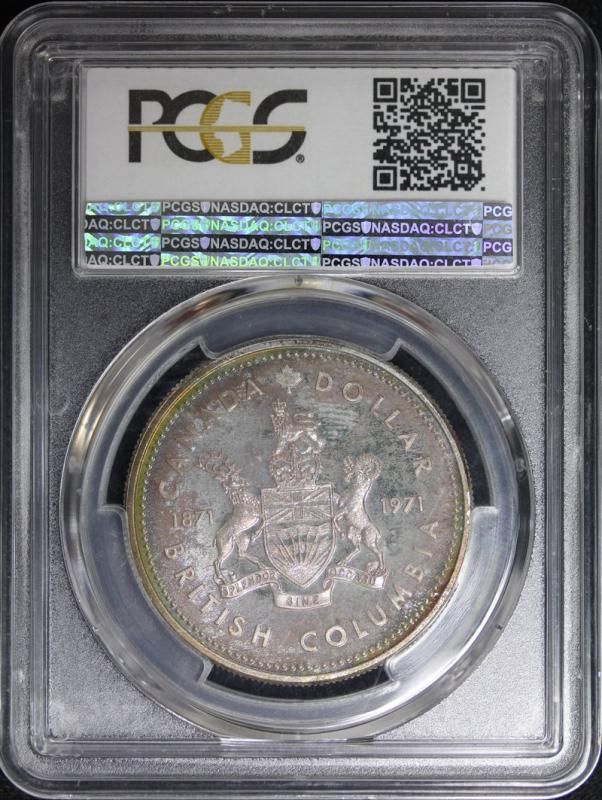 カナダ Canada エリザベス2世 ブリティッシュコロンビア カナダ自治政府加入100年 1ドル銀貨 1971年 PCGS SP68